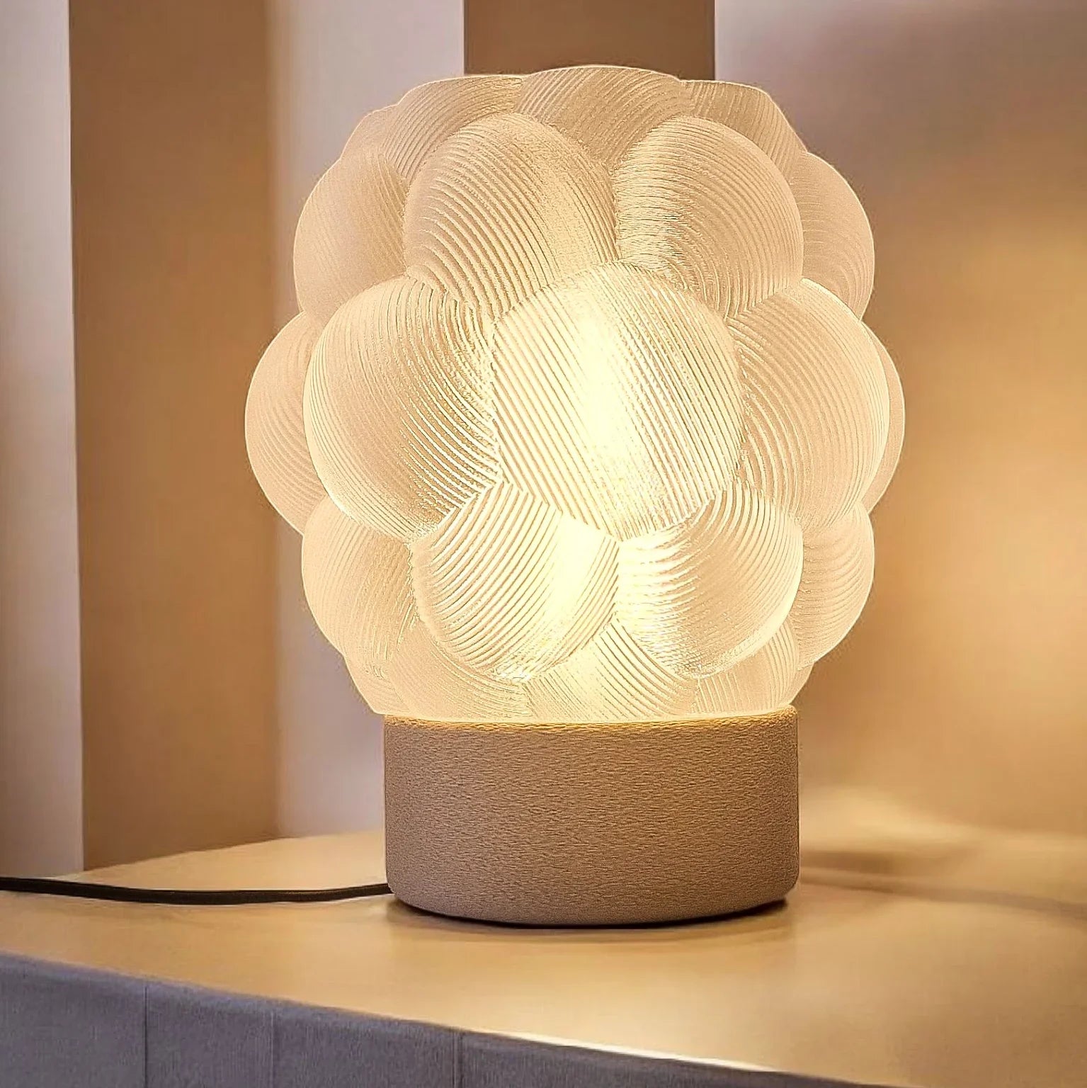 Apo Malis – moderne tafellamp met bolvormige lichtkap & zandkleurige textuurvoet De Apo Malis tafellamp is een harmonie tussen modern... Lees meer over PLA & 3D-printen