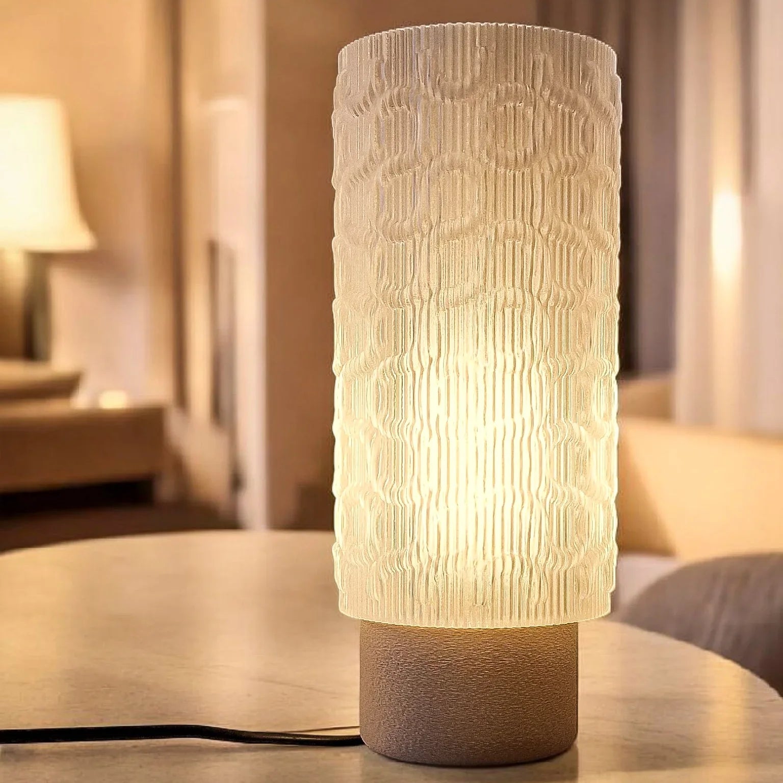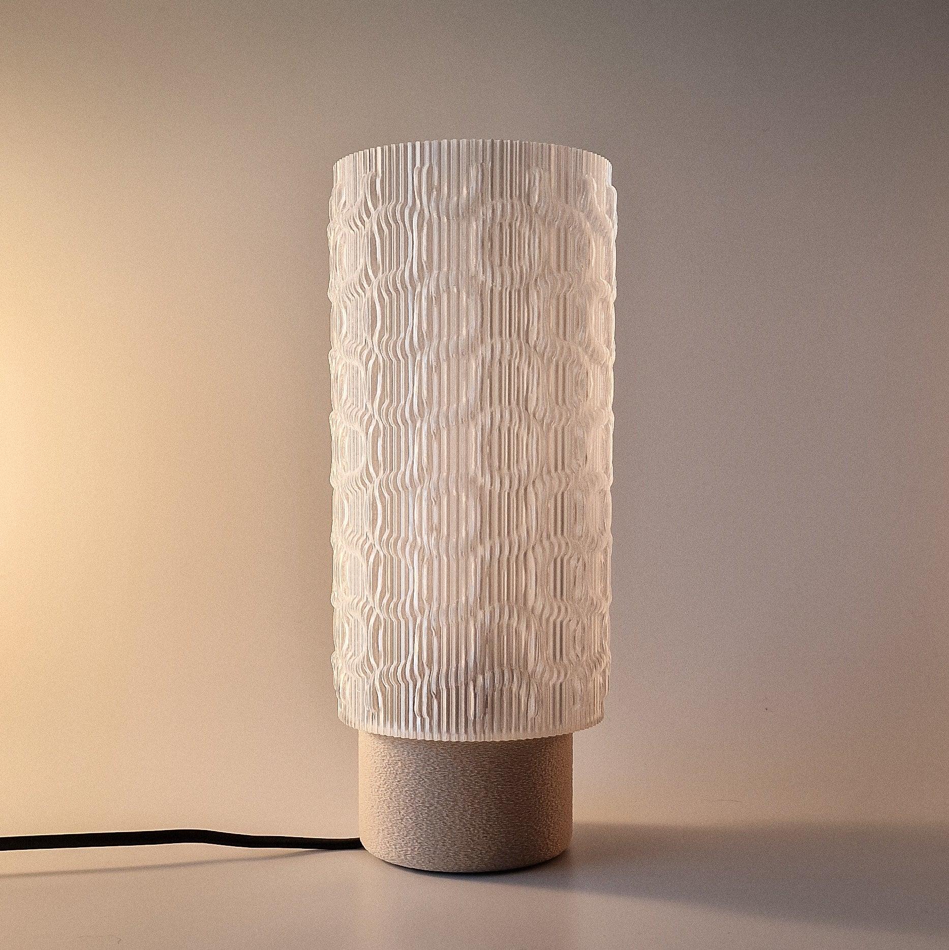 Ripple Column – moderne tafellamp met transparante kap en zandkleurige voet De Ripple Column tafellamp is een stijlvol, modern designstuk... Lees meer over PLA & 3D-printen